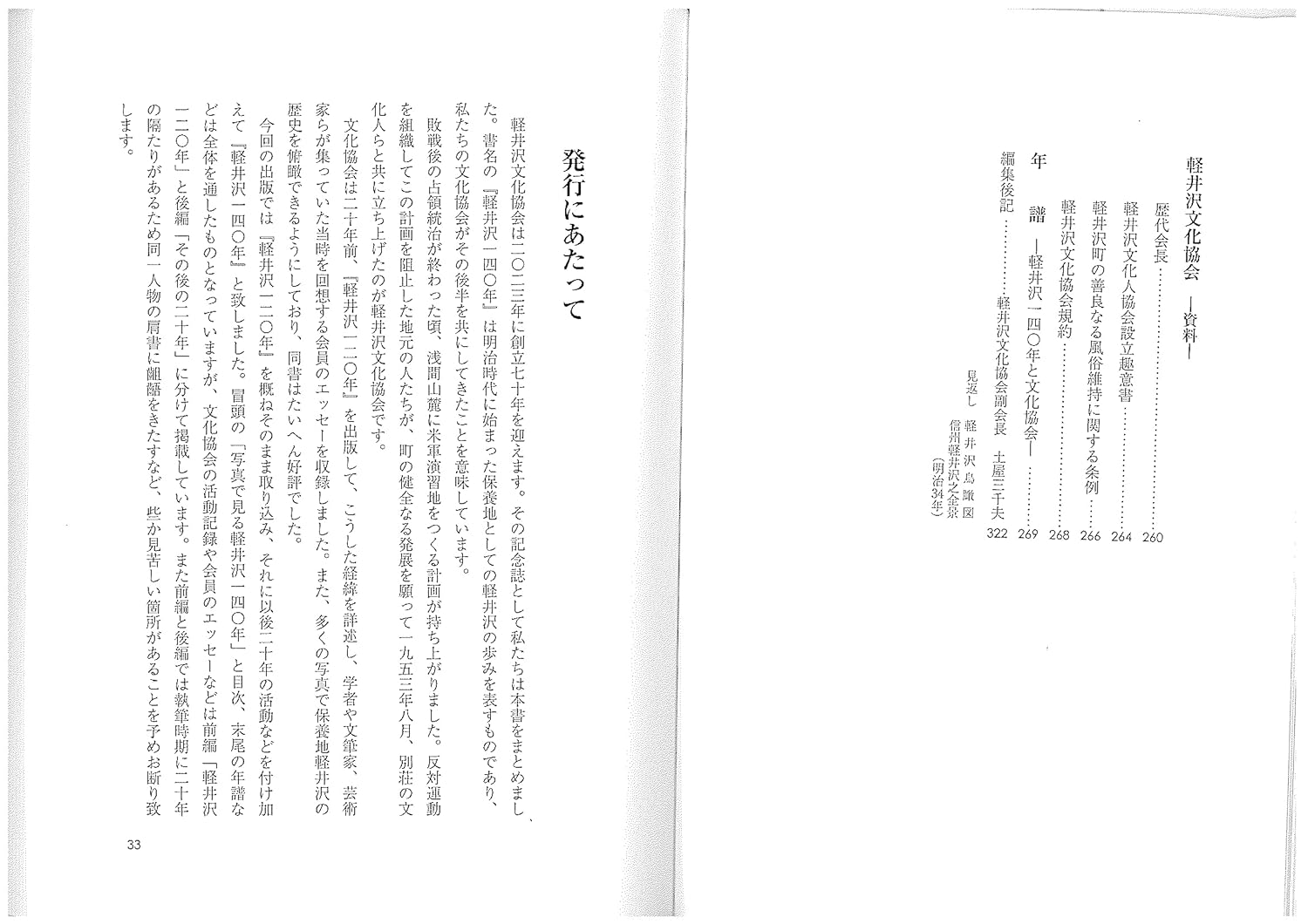 創設70年目を迎える軽井沢文化協会が、軽井沢の歴史と共に同会の歩みを振り返る『軽井沢140年』を発行した。同会は1953年、戦後の軽井沢で持ち上がった米軍演習地を作る計画に対する反対運動をきっかけとして誕生した。2003年、創立50年の節目に軽井沢の歴史や文化協会の成立過程とその歩みを一冊にまとめて発行したが、好評のうちに絶版となっていた。今回は、その後の約20年分の軽井沢の歴史や、会員のエッセイなどを加えて増補。巻頭には140年の軽井沢の歴史を振り返る写真も多数掲載している。